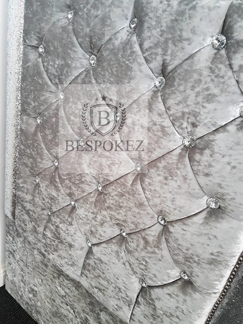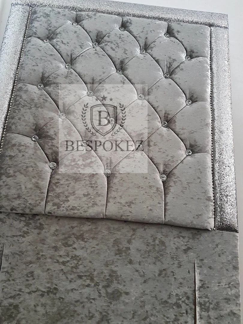 The Pretoria glitter headboard is a very interesting design. it is simple but very attractive with its decorative diamonte style, upholstered from the finest crushed velvet material on Foamed board