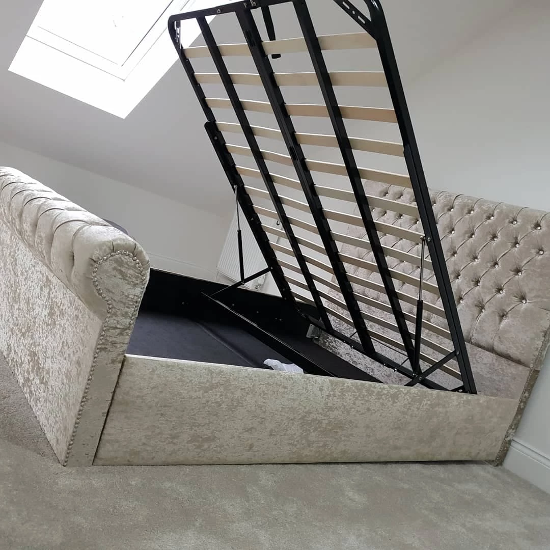 For a real showpiece choose the Sleigh Chesterfield velvet Bed Frame for your bedroom. This outstanding bed frame boasts a unique upholstery design and a sumptuous, sleigh bed shape. It has a large foot end to create a more broad look