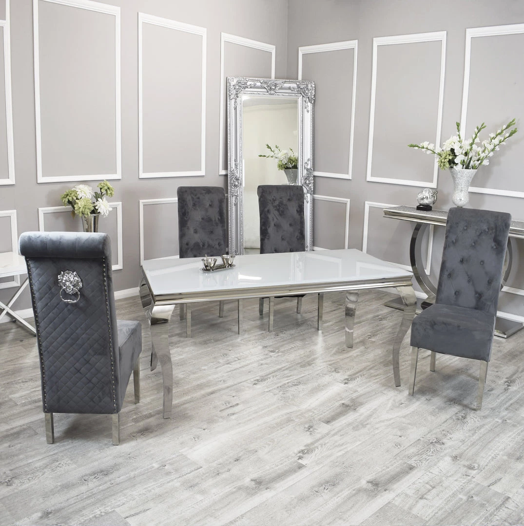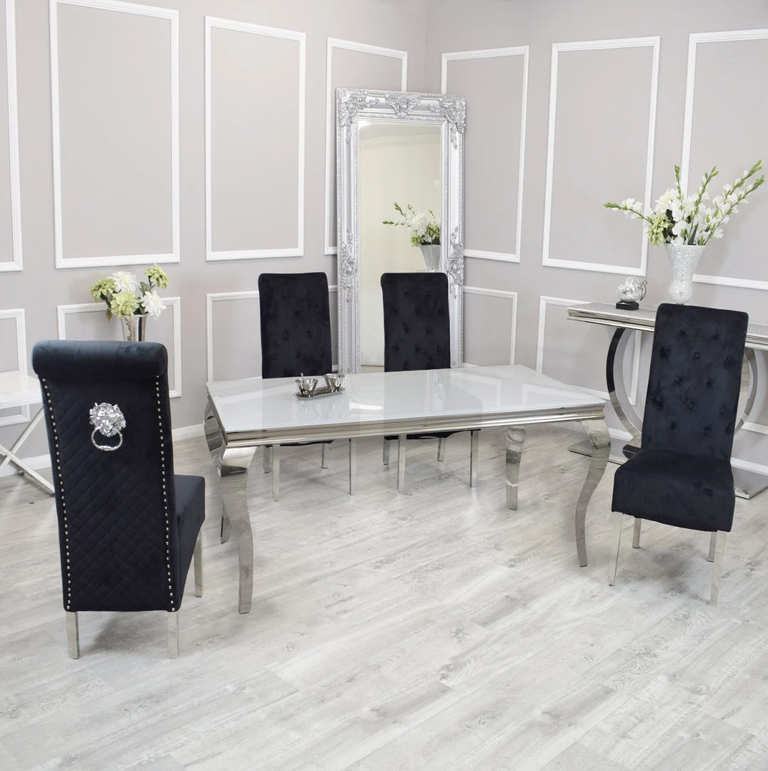 The Sofia Dining Table Set features with two unique products to create a masterpiece dining set. It has the Imperial Dining Table which is a contemporary modern version of a traditional French rococo style dining Table with its polished steel legs and frame and Black or White Glass Top and the Sofia Dining Chairs