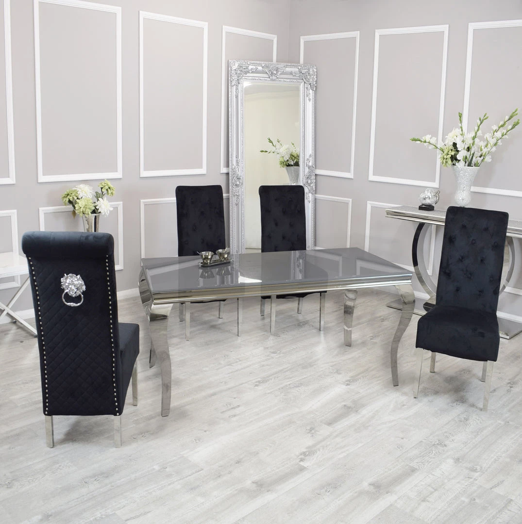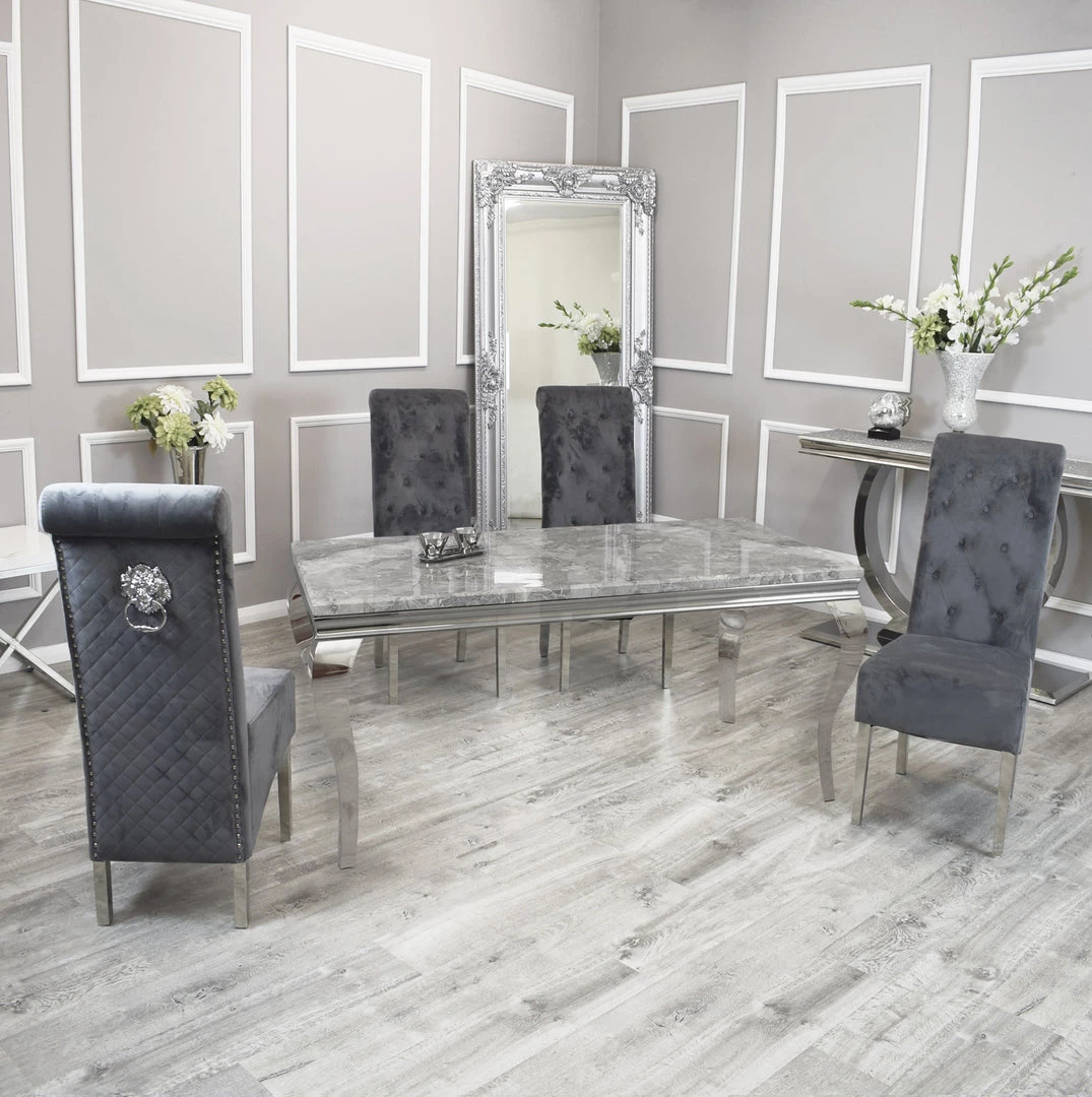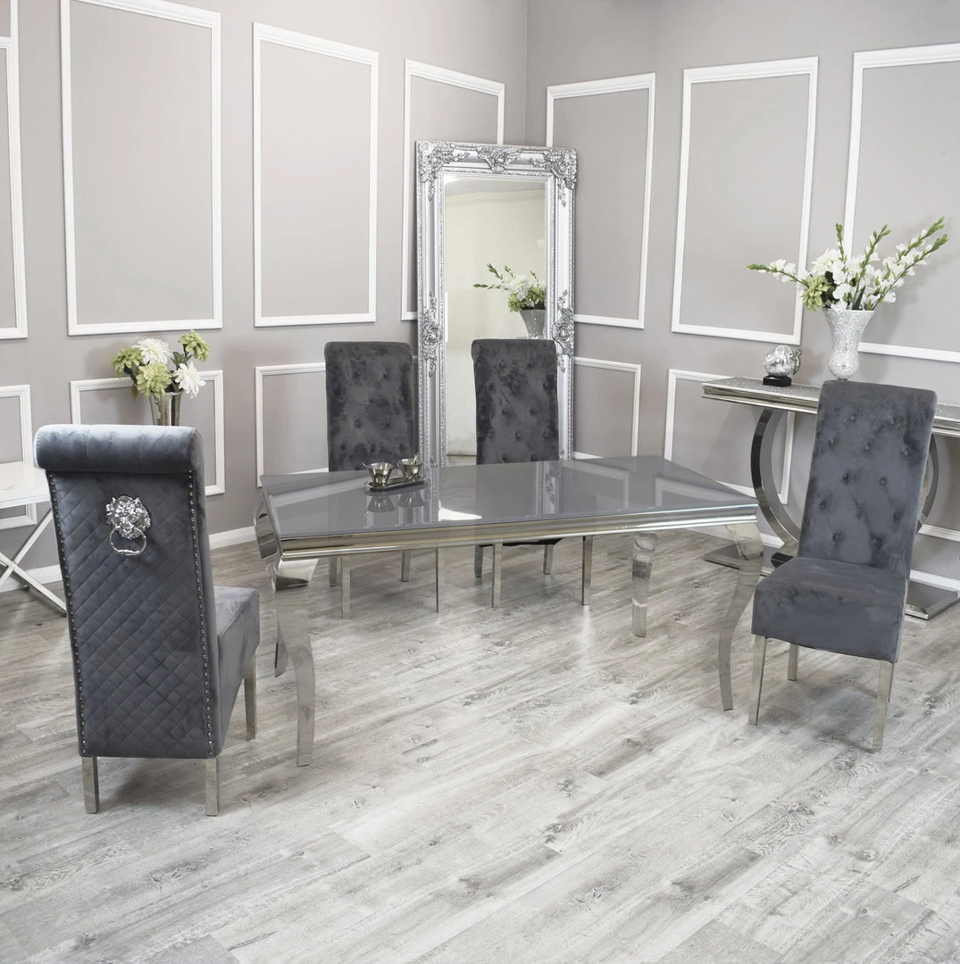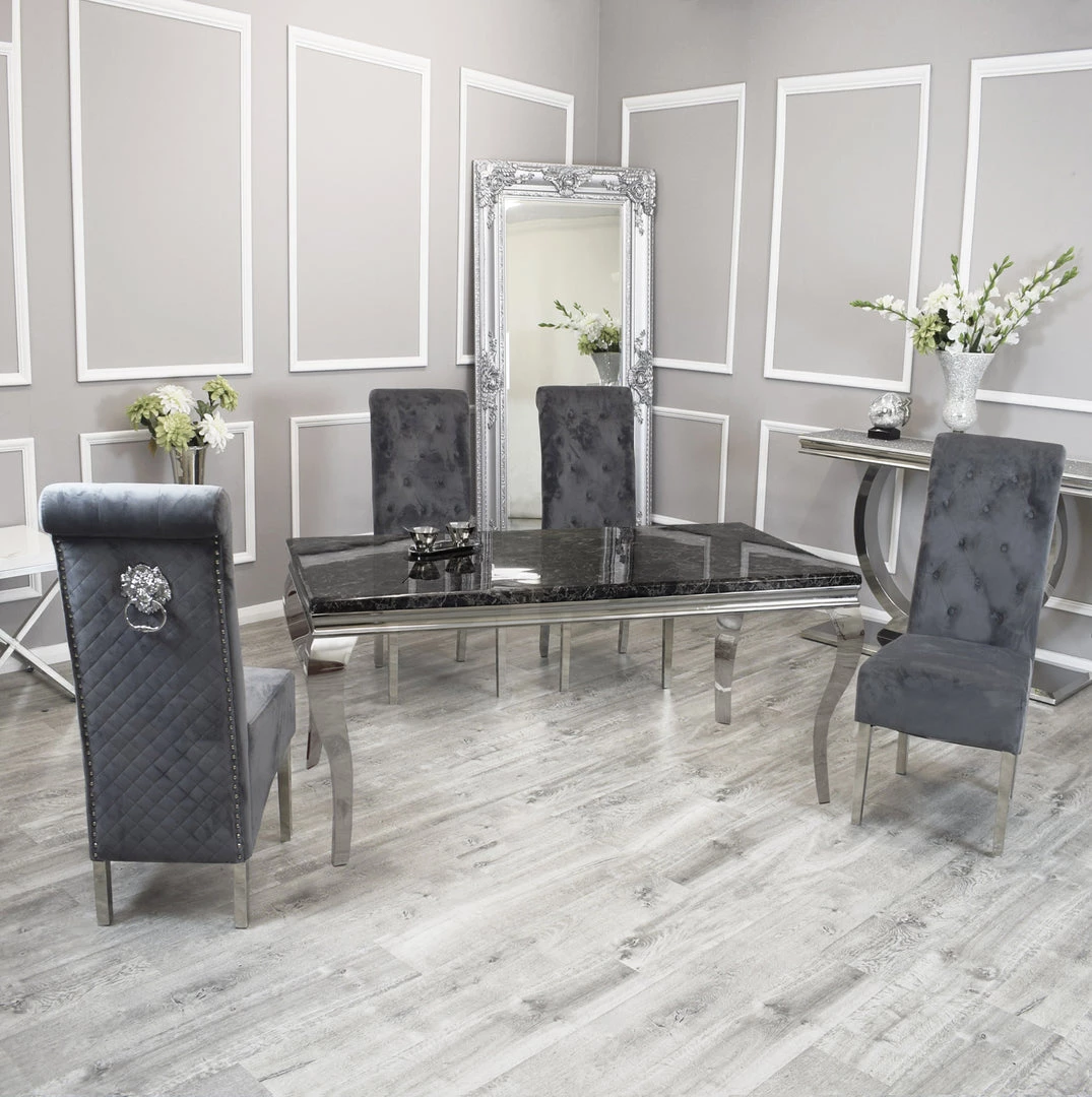 The Sofia dining chairs stand tall, perfectly upholstered, clean smooth velvet with a beautiful tidy checkered upholstery. It comes with beautiful shiny chrome stainless steel legs and a large lion knocker center piece. These velvet dining chairs will stand out in any room whether it has carpet or laminate