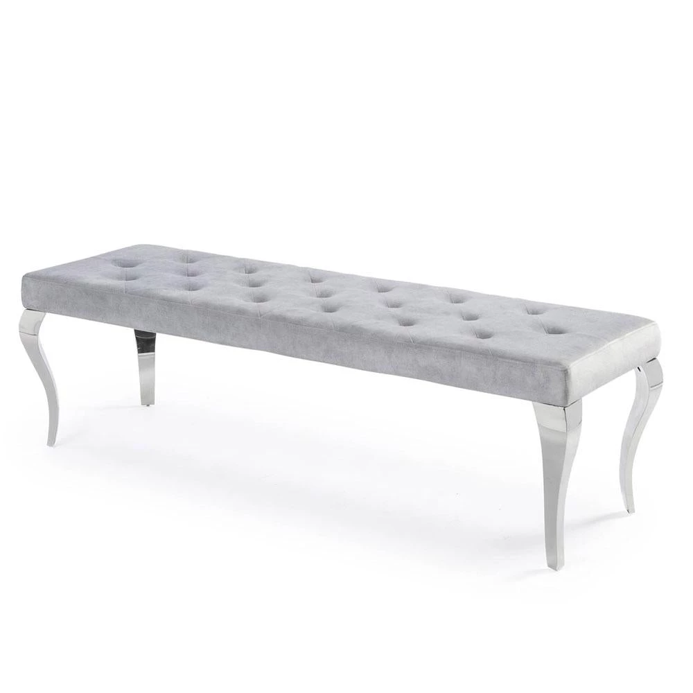 Our Imperial/Louis Dining Bench is an alternative space saving piece of furniture that will compliment our Louis Dining Table range. A more understated design, this bench features a simple light grey velvet fabric on a plain bench with our signature Louis legs. Pair with our Megan and Nicole Dining Chairs to complete the look.