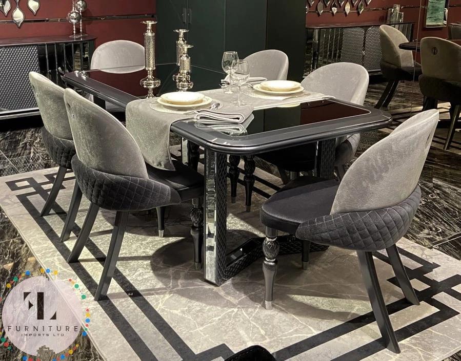 Grey & Chrome Set – 180cm Grey And Chrome Table + 6 x Cenova Grey Velvet + Grey Wooden Legs