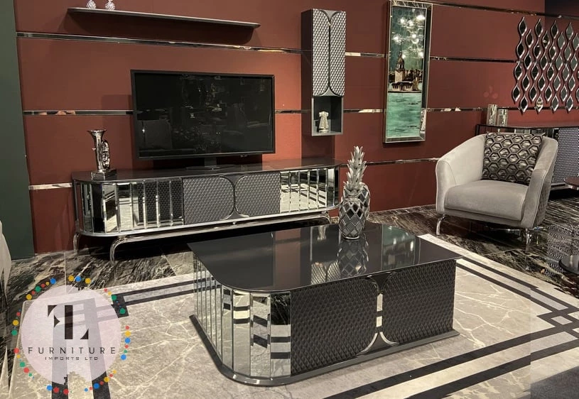 The All New Cenova TV Unit is Designed to add a touch of luxe to your space, this Tv unit is sure to catch compliments. With rich gloss finished with a parquet design, this Tv unit is timeless and classically beautiful. The gold-plated steel frame and matching handles add a fresh, modern edge with a subtle sparkle, while the large surface top gives you the space to make it your own, ideal for displaying flowers, photos and more. With 4 internal compartments, there’s plenty of room to store anything from barware to book to bits and bobs that need a home.