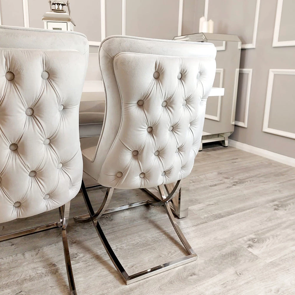 The Sandhurst Dining Chair range is the ideal choice for a large scale luxury style. This beautiful range features a deep buttoned back on a smooth velvet finish. Curved crossed chrome legs complete this range. Available in Light and Dark Grey.