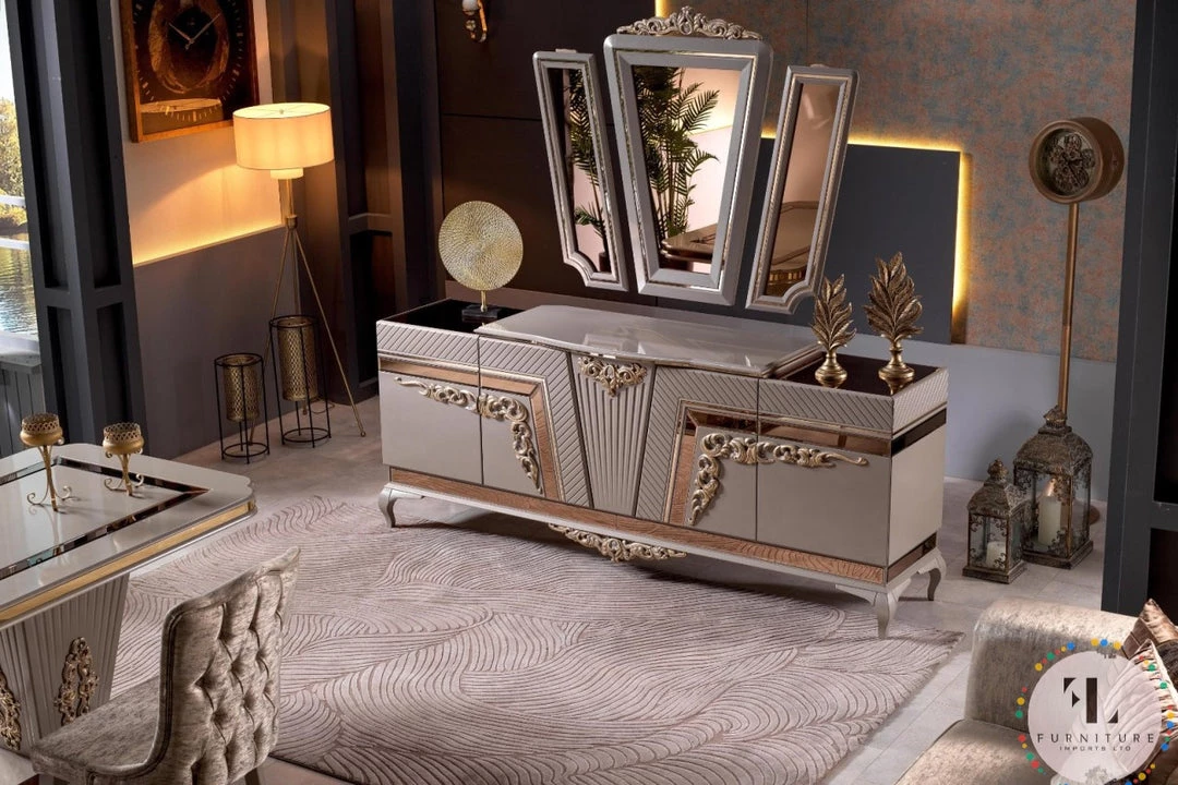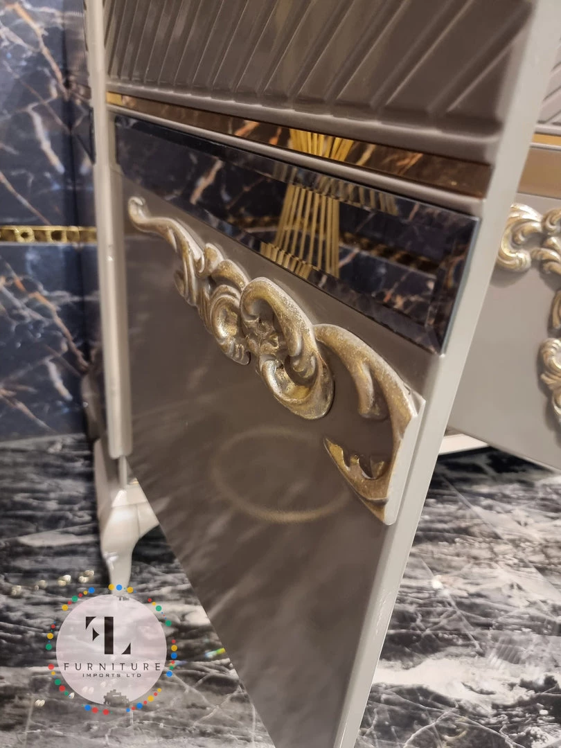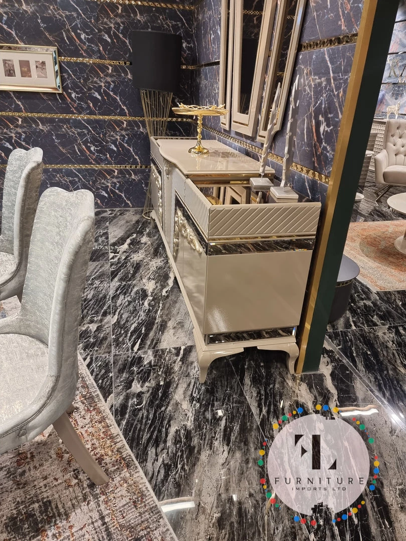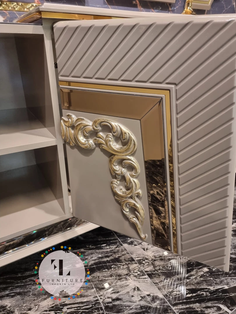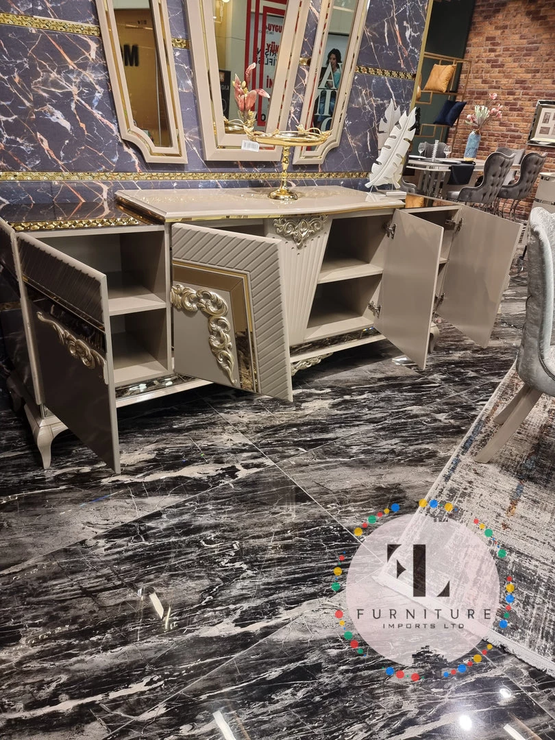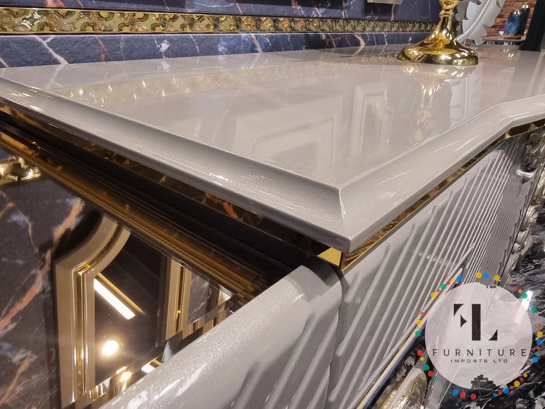The Verona Sideboard is Designed to add a touch of luxe to your space, this sideboard is sure to catch compliments. With rich gloss finished with a parquet design, this unit is timeless and classically beautiful. The gold-plated steel frame and matching handles add a fresh, modern edge with a subtle sparkle, while the large surface top gives you the space to make it your own, ideal for displaying flowers, photos and more. With 4 internal compartments, there’s plenty of room to store anything from barware to book to bits and bobs that need a home.
