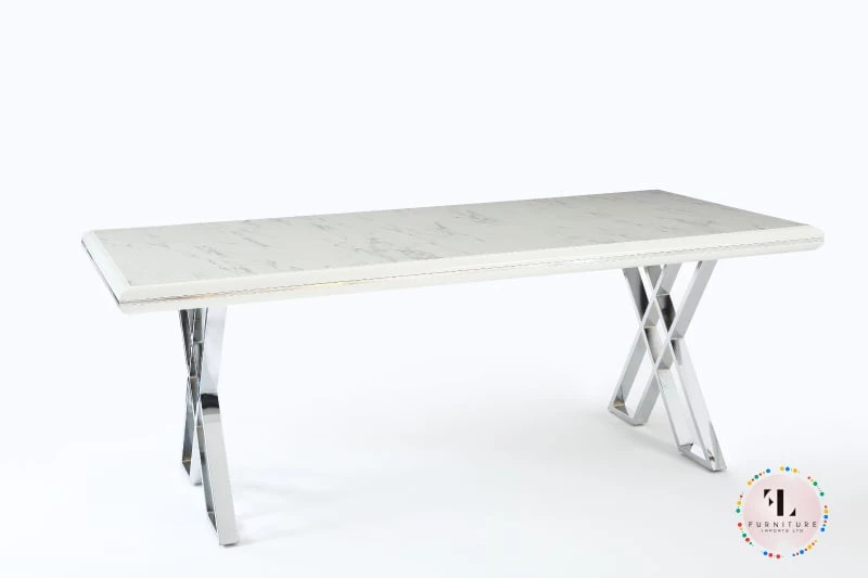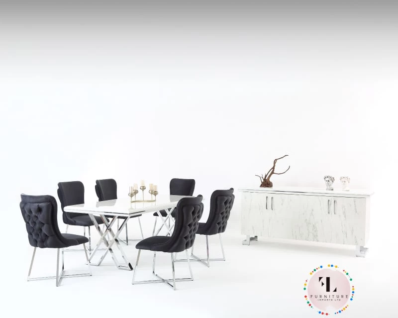 We also have a range of colours available, from glossy white and black – all of which give a sense of understated style to the shine of the finish on these chrome dining table and chairs. The chairs come in matching shades, and are upholstered in velvet fabric and other fabric options that are stylish, yet practical
