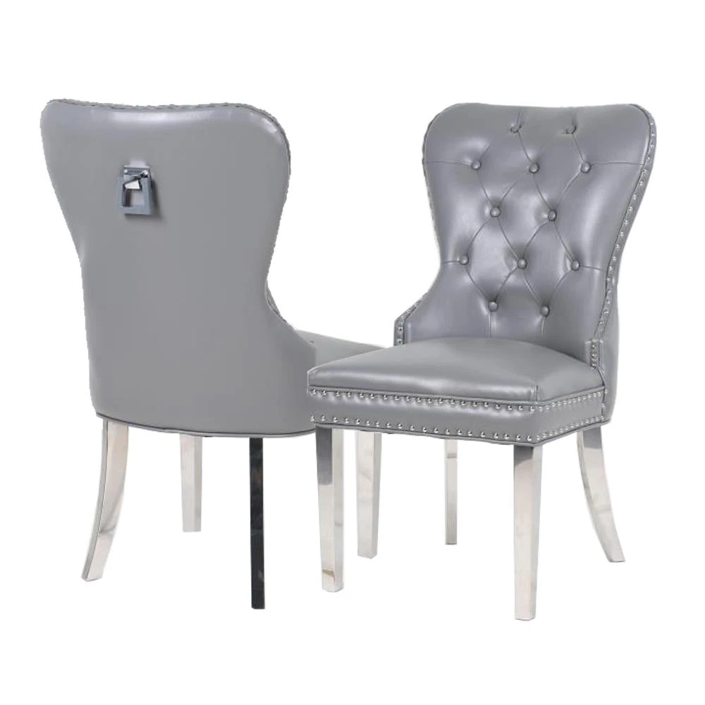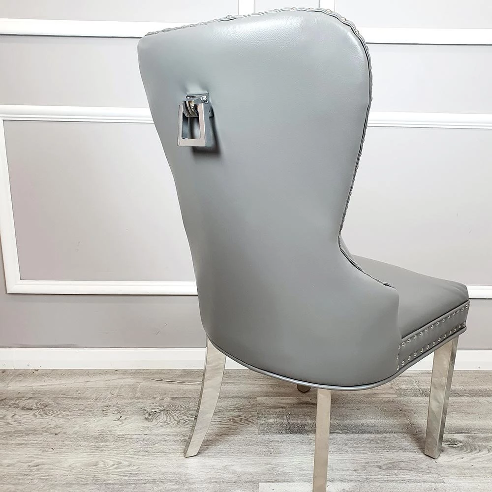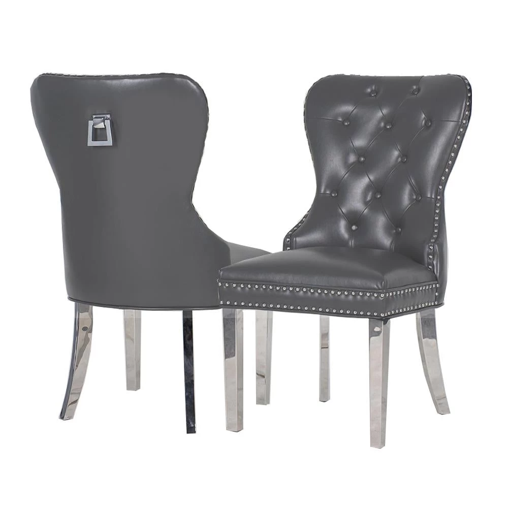 Mayfair Dining Chairs. Now available in a Faux Leather finish and featuring a new style chrome square knocker. Double studding along the edge of the chair gives this piece a regal edge. Available in both dark and light grey finishes.