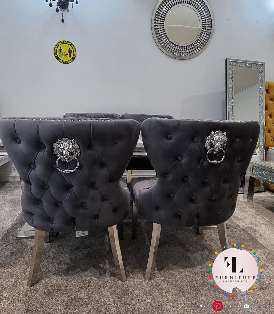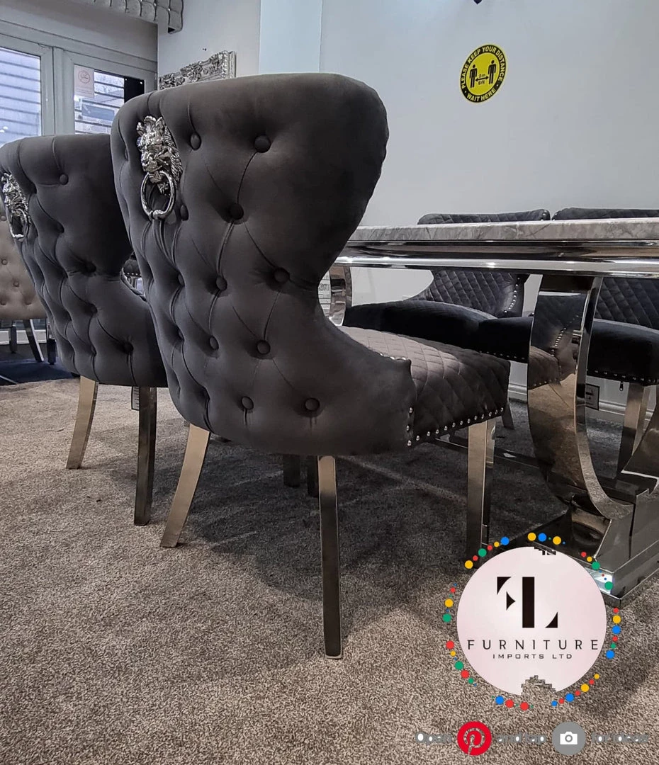 Elegantly designed to conquer any modern interior. This grand Valentino dining chair embodies a prestigious & ergonomic design, with an elegantly wrapped smoothed brushed velvet fabric, swivel, comfortable padding, chic chrome legs, soft tufted buttons, a lavish lion knocker back and last but not least a rich pearl embedded detailing