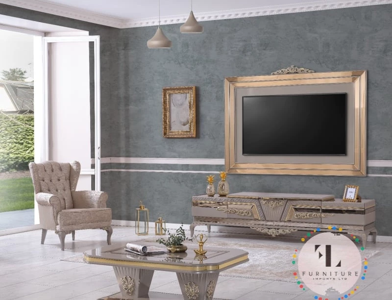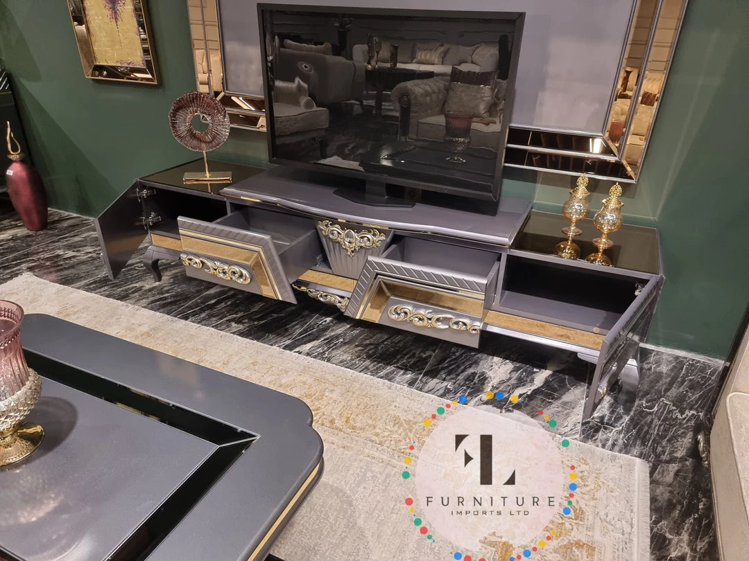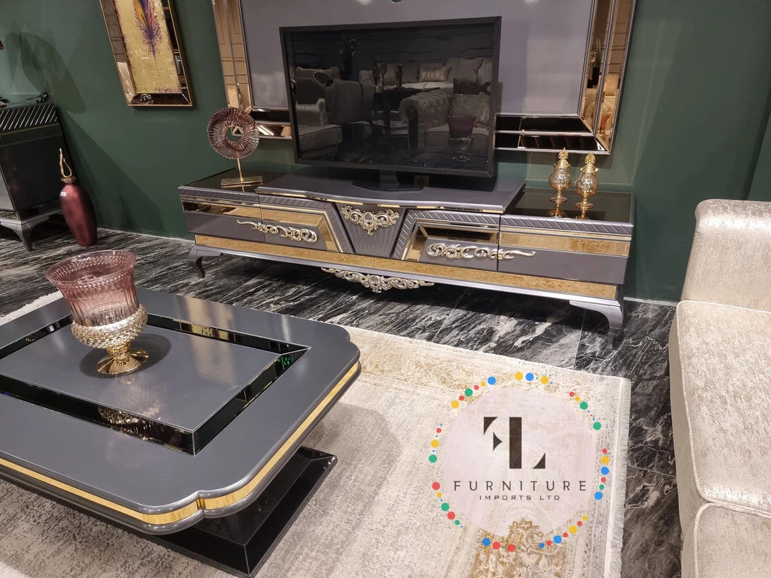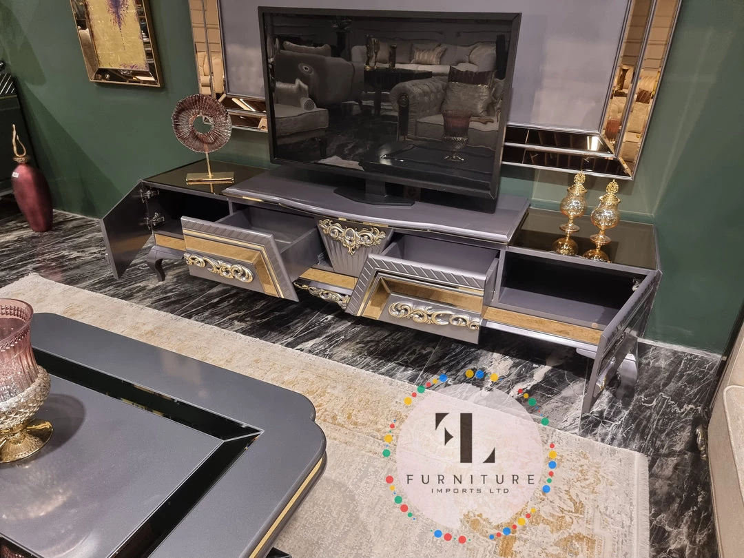 The Verona TV Unit is Designed to add a touch of luxe to your space, this TV Unit is sure to catch compliments. With rich gloss finished with a parquet design, this unit is timeless and classically beautiful. The gold-plated steel frame and matching handles add a fresh, modern edge with a subtle sparkle, while the large surface top gives you the space to make it your own, ideal for displaying flowers, photos and more. With 3 internal compartments, there’s plenty of room to store anything from barware to book to bits and bobs that need a home.