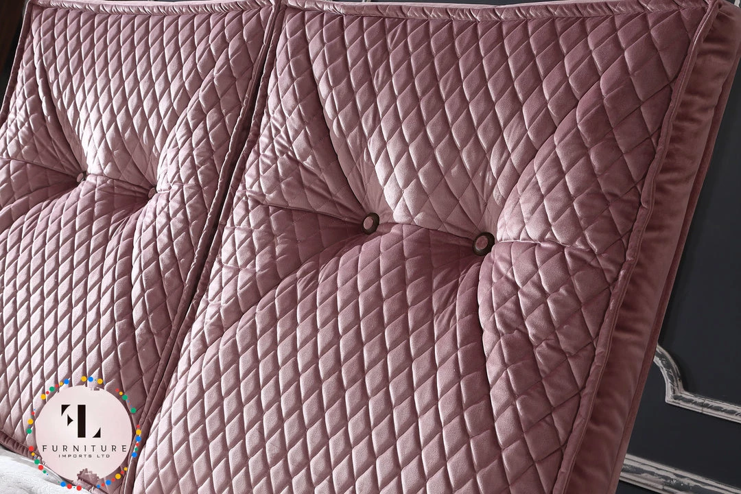 Clad with rich, hand upholstered in a Premium Grade Turkish Velvet. This Bed comes in a Range of Materials and are Completely Bespoke. All the more enriching is the grand and immense headboard, as well as the curved design of the frame
