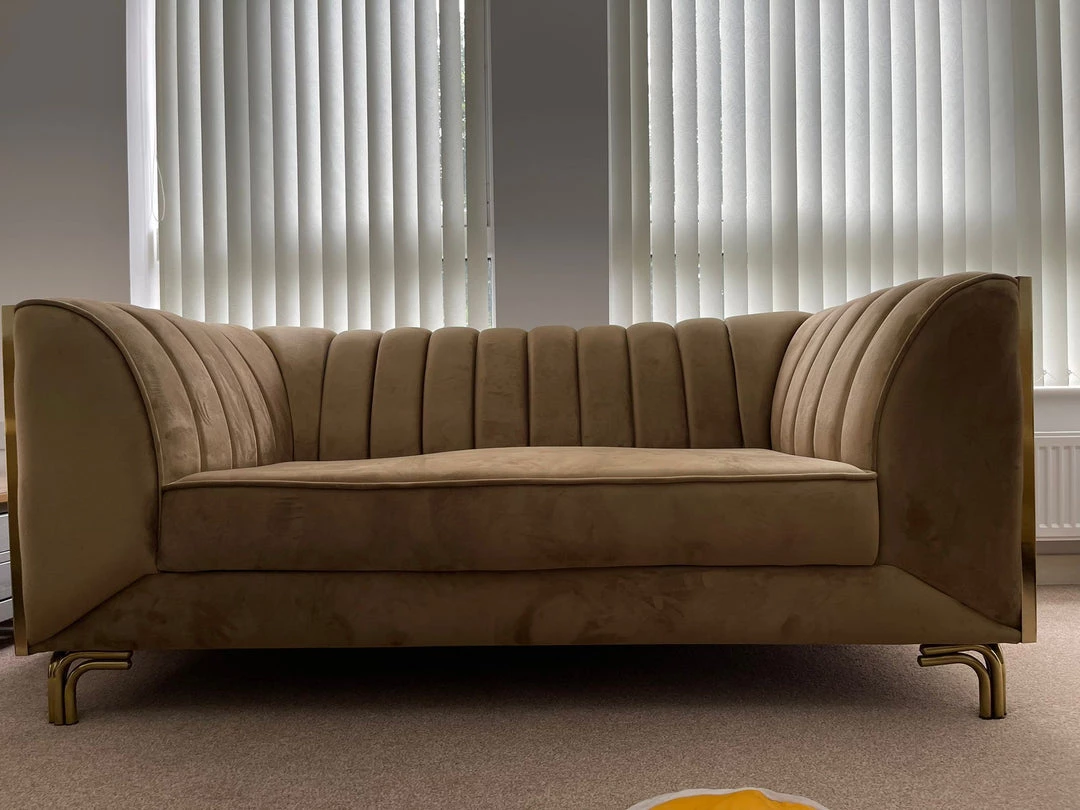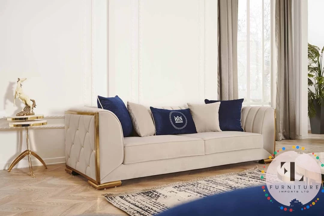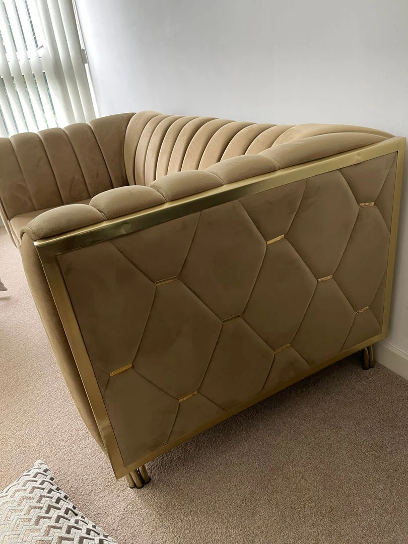 A simple thick padded sofa meets a smooth metal finish. The arm shape balances the formality of a sofa with the inviting vibe of a more casual, low-armed heavily padded seat. Its has a beautiful metal u shaped trim which serves as a leg as well as a unique design on the arms of the sofa. The seat cushions are heavily padded for long durable use. The centre piece give this sofa its own unique branding