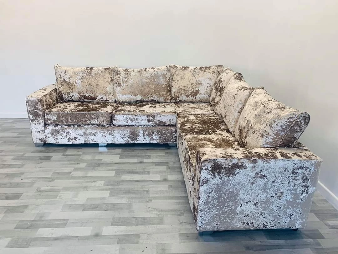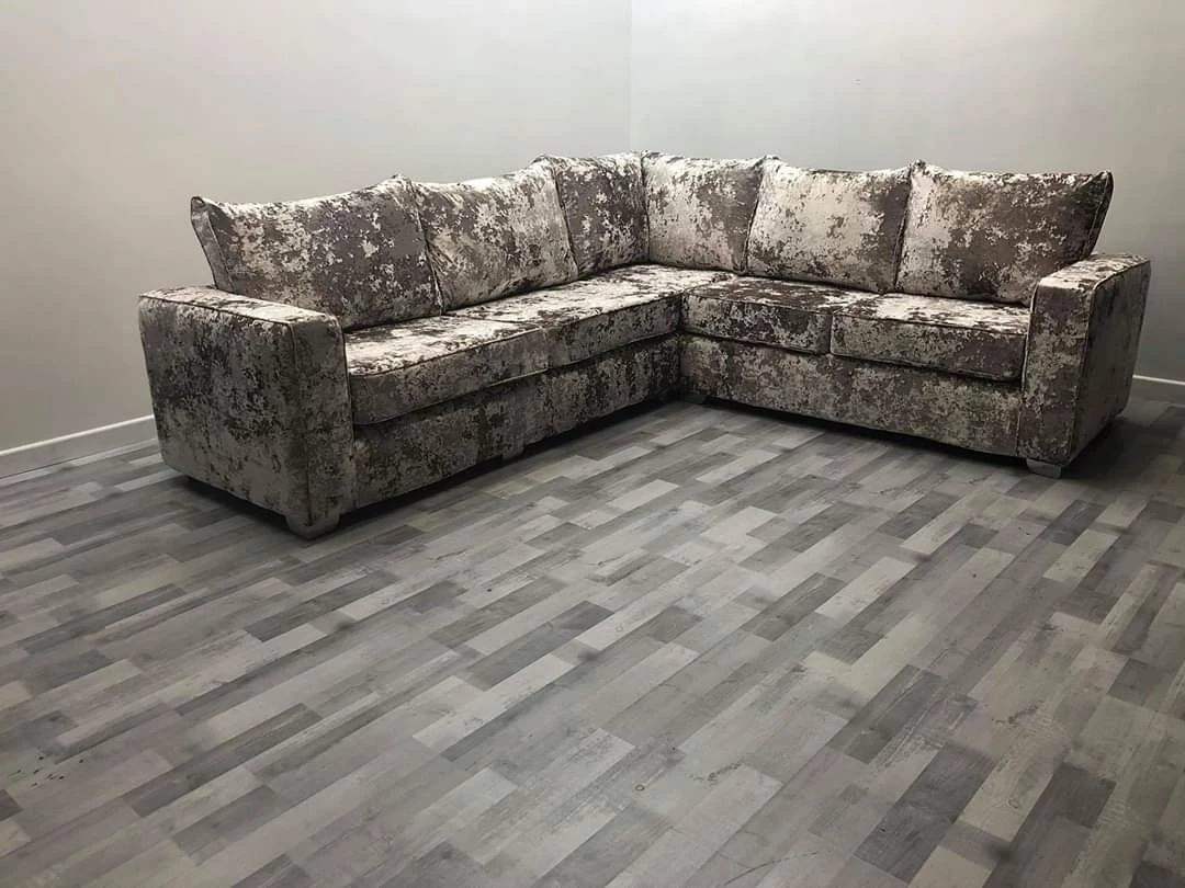 A Beautiful contemporary design corner chaise sofa. The Charles range features a contemporary design with a luxury Lustro Crushed Velvet finish and elegant upholstered chunky arms
